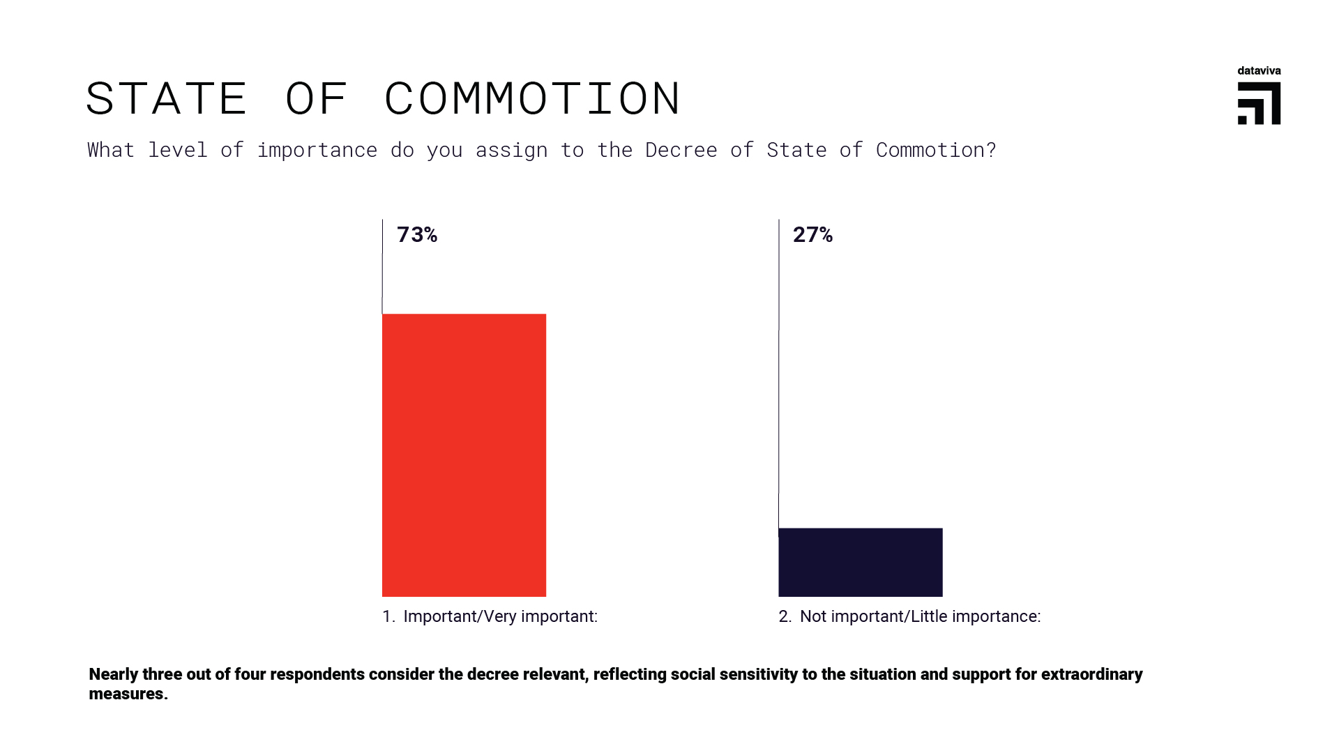 Regarding the Decree of State of Commotion, 73% consider it important or very important, reflecting public sensitivity to the current situation and support for the adoption of extraordinary measures in defense of national stability.